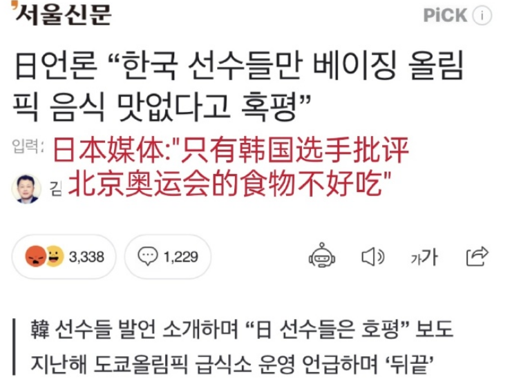 然而日本媒体却报道:“只有韩国选手批评北京冬奥会的食物不好吃”。