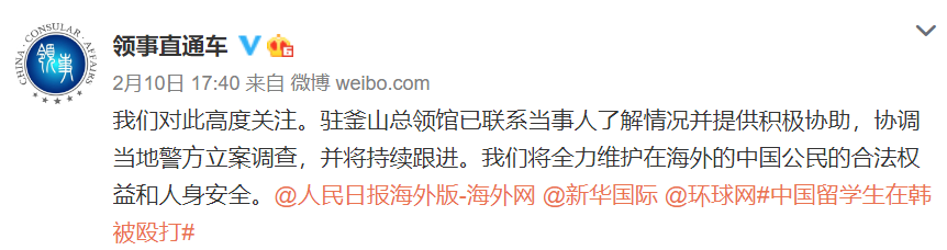 中国新闻网:中国驻韩大使馆阐明立场环球网:留学生在韩被打?外交部领保中心回应!