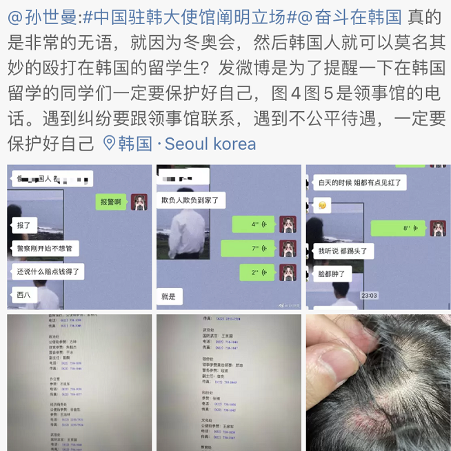 2月10日凌晨,有微博网友爆料称:“真的是非常的无语,就因为冬奥会,然后韩国人就可以莫名其妙的殴打在韩国的留学生?”