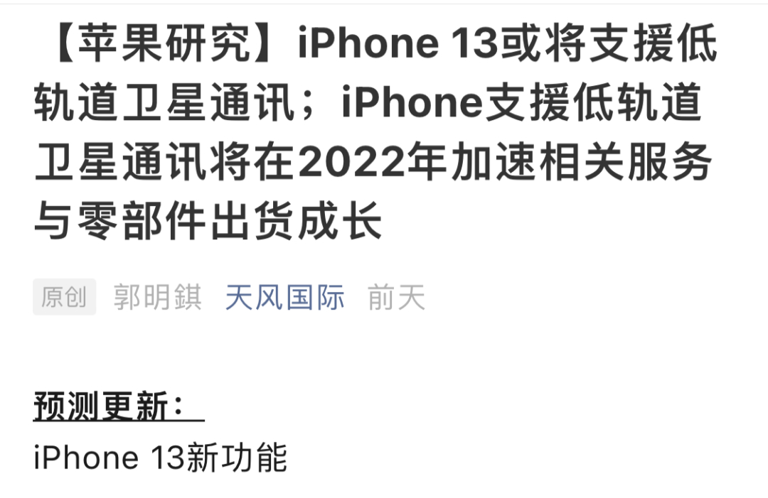 据“苹果知名爆料人”郭明錤的分析报告:iPhone 13有望在硬件规格上支持低轨道卫星通讯: