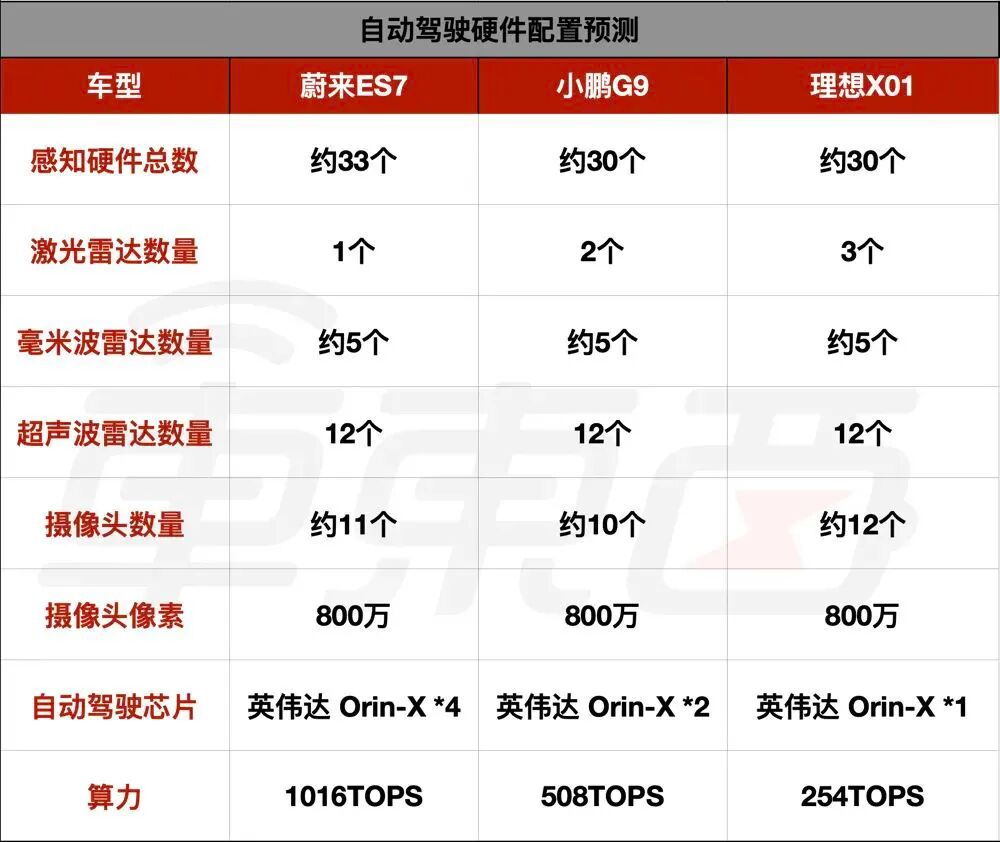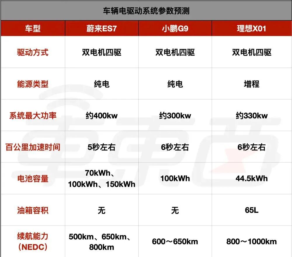 动力方面,小鹏G9、蔚来ES7依然采用纯电的驱动形式,而理想X01继续沿用增程器混动的驱动形式。