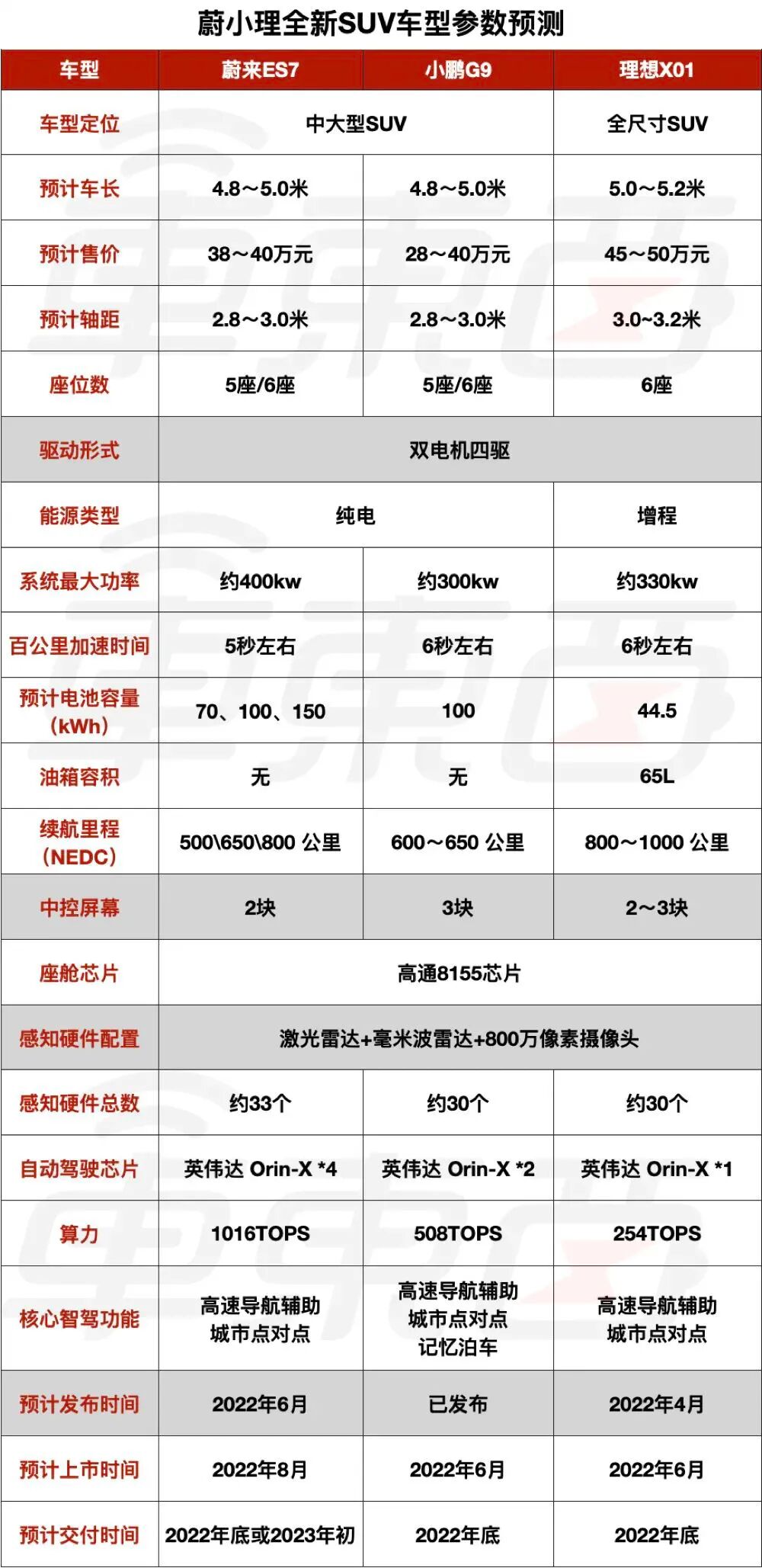 根据汽车博主@车东西的统计,今年三家要发布的新车 —— 小鹏G9、理想X01、蔚来ES7 都属于中大型SUV车型。