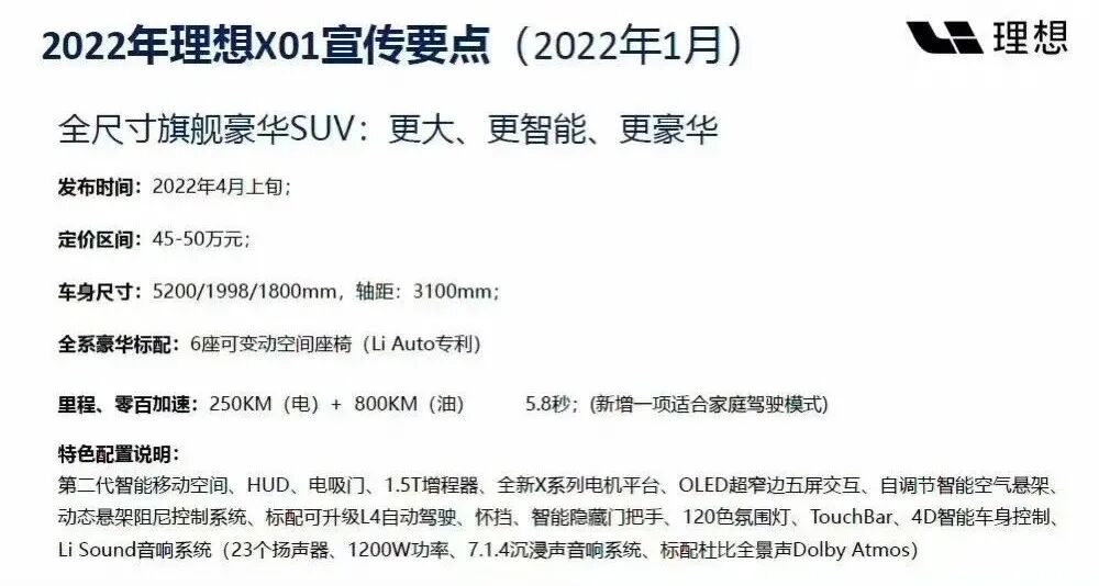 另一边的理想X01,相关人士根据宣传要点内容,预计车长会在5m左右。