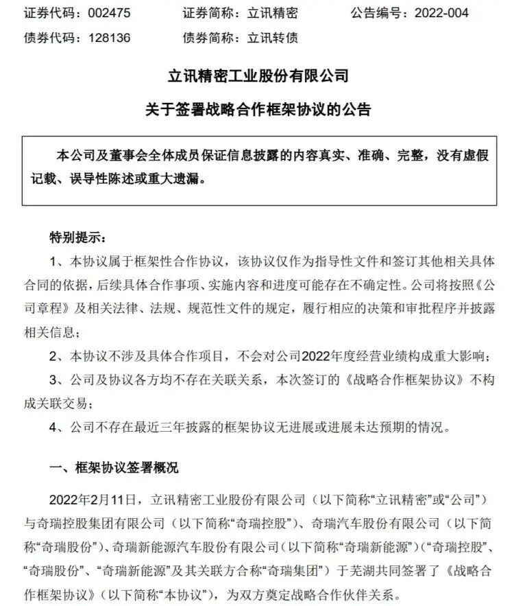 2月11日晚间,立讯精密发布公告称:公司与奇瑞新能源汽车股份有限公司拟共同组建合资公司,专业从事新能源汽车的整车研发及制。
