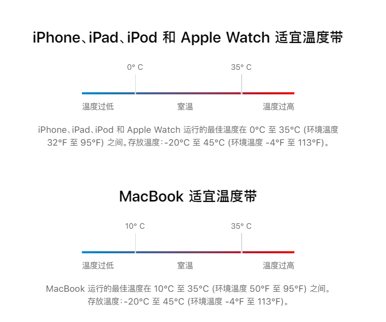 官方称苹果设备理想温度范围是在16°C至22°C之间,简而言之就是:不能太冷,也不能太热。
