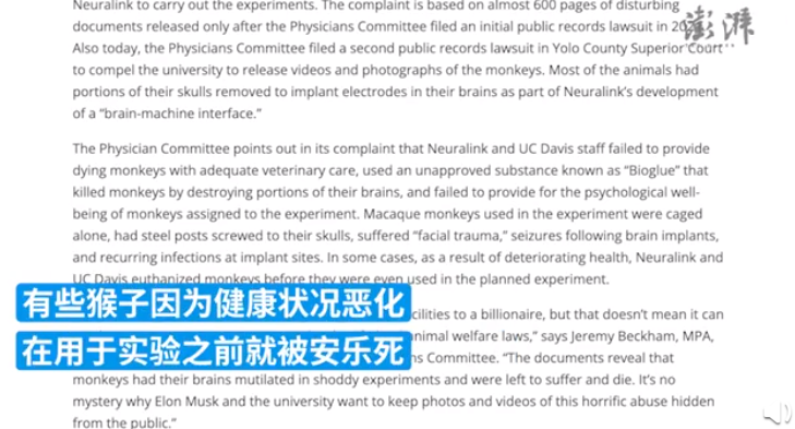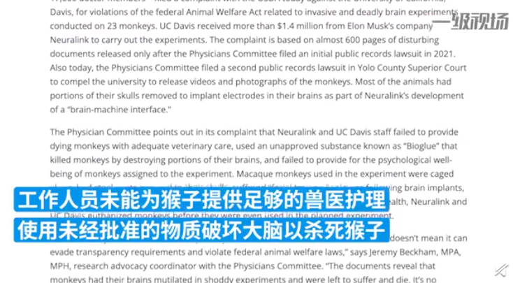 美国动物保护组织PCRM控诉马斯克旗下公司Neuralink及合作方“虐猴”,该组织称获得的600多页记录显示,23只猴子被进行侵入性和致命脑实验,其中至少死了15只猴子。