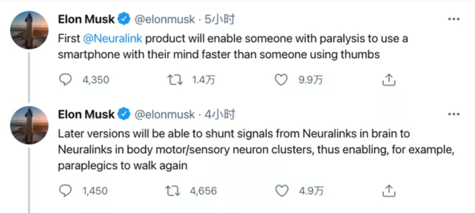 随后,马斯克发布推文称,Neuralink公司的首款产品将能够让瘫痪的人使用意念玩手机,而且比使用拇指的人更快。如果用更高版本的设备,可以让截瘫患者能够再次行走。
