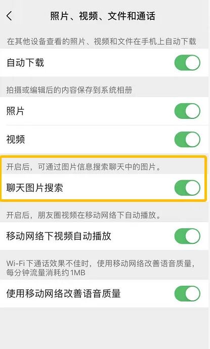 开启教程:iOS版微信在【设置】—【通用】—【照片、视频、文件和通话】—开启【聊天图片搜索】功能。