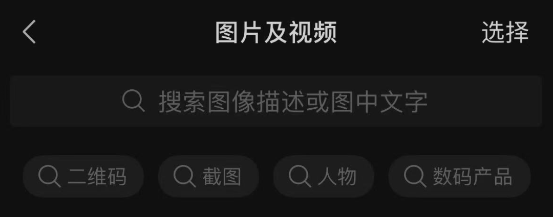 我们可以直接搜索图片描述或图片中的文字,也可以按照二维码、截图、人物、食物等分类搜索进行查找。