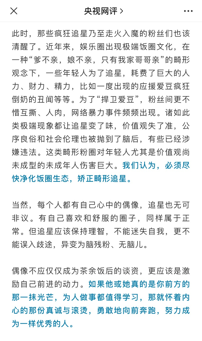 类极端现象都让追星变了味,价值观失了准,公序良俗和社会伦理也被抛到了脑后,有些已经涉嫌违法!