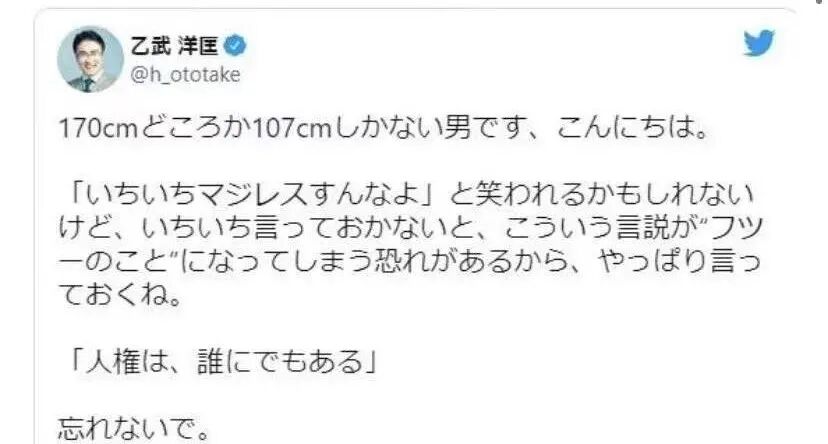 日本作家乙武洋匡(自幼有先天性四肢切断症,由于自传《五体不满足》而知名)首先发推特表示“人人都应该有人权。”