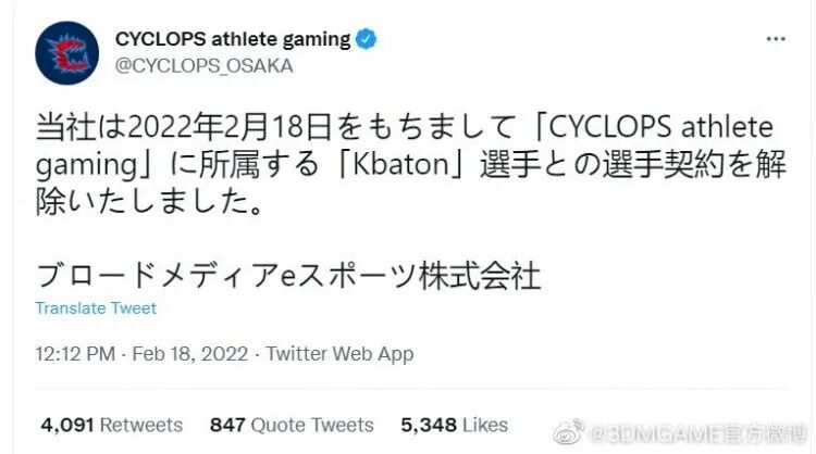 CYCLOPS《使命召唤》的项目选手Kbaton居然在推特上对Tanukana表示支持。