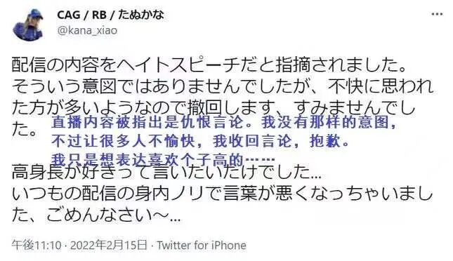 然后当天晚上,Tanukana在社交网络上发文解释,自己只是想表达喜欢高个儿男孩,并为自己的出言不慎向大家说:对不起~...
