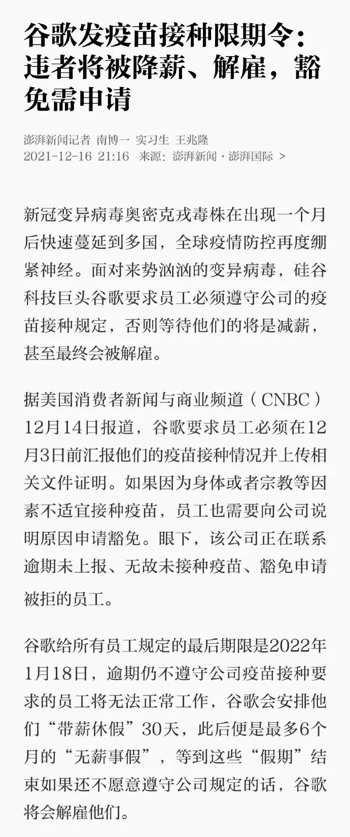 2021年12月,谷歌要求员工必须接种新冠疫苗,否则就会直接安排30天“带薪休假”,接下来就是6个月“无薪事假”,直到被解雇……