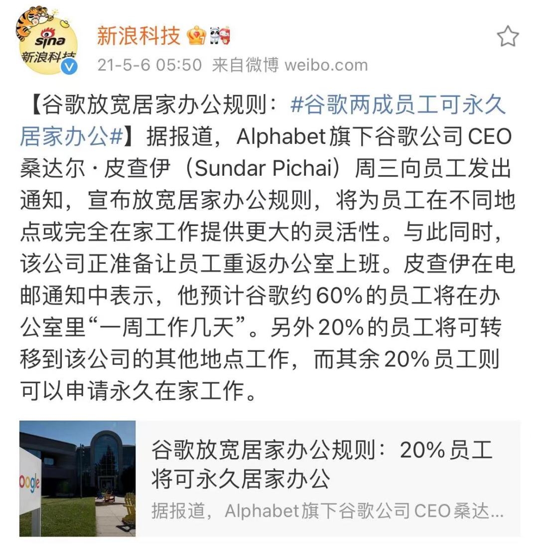 2021年5月,谷歌又宣布员工可以申请永久居家办公,可把不少人羡慕坏了。