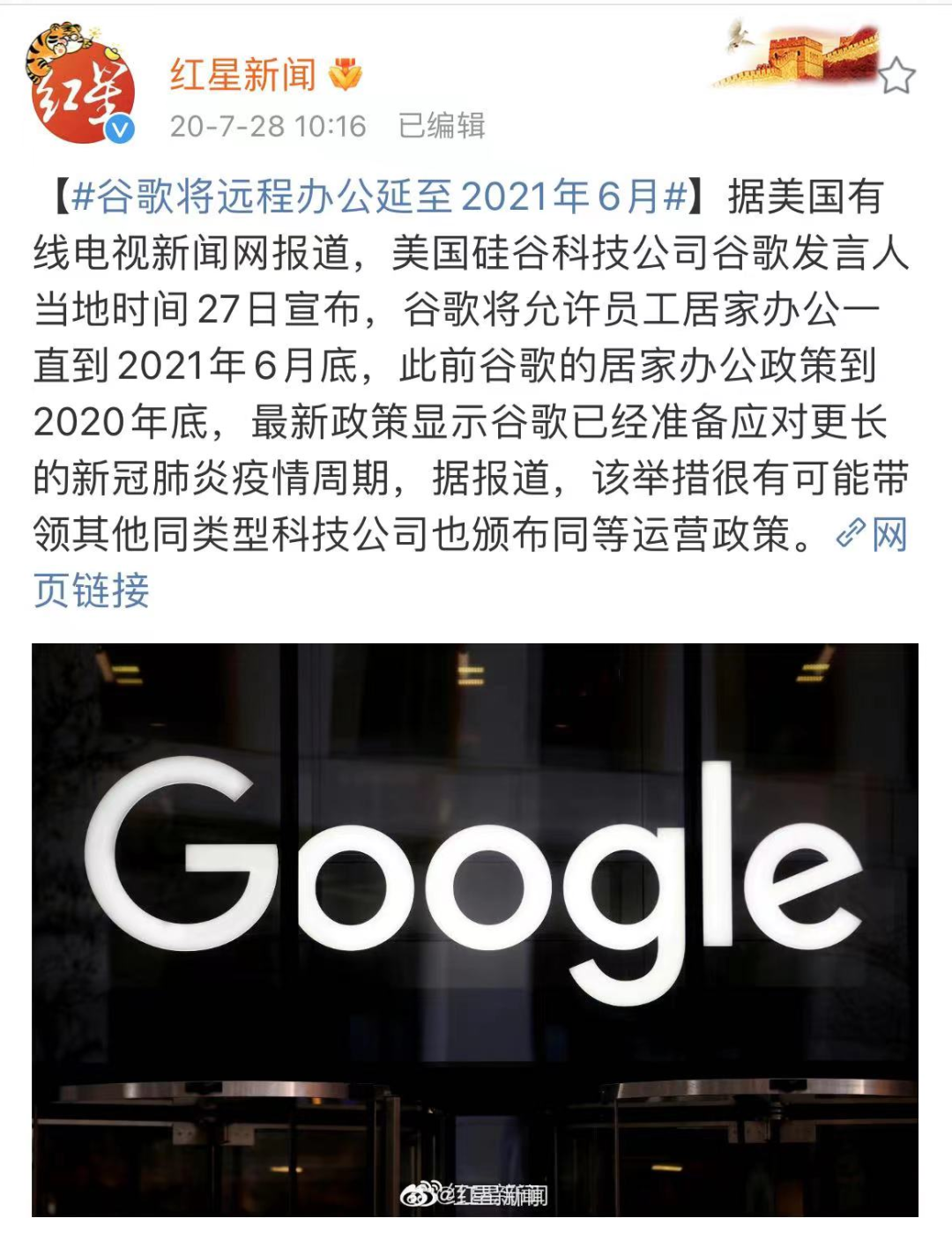 谷歌是首批因新冠疫情要求员工居家办公的大型企业之一,2020年3月,美国疫情爆发,谷歌直接宣布北美所有员工在家办公。