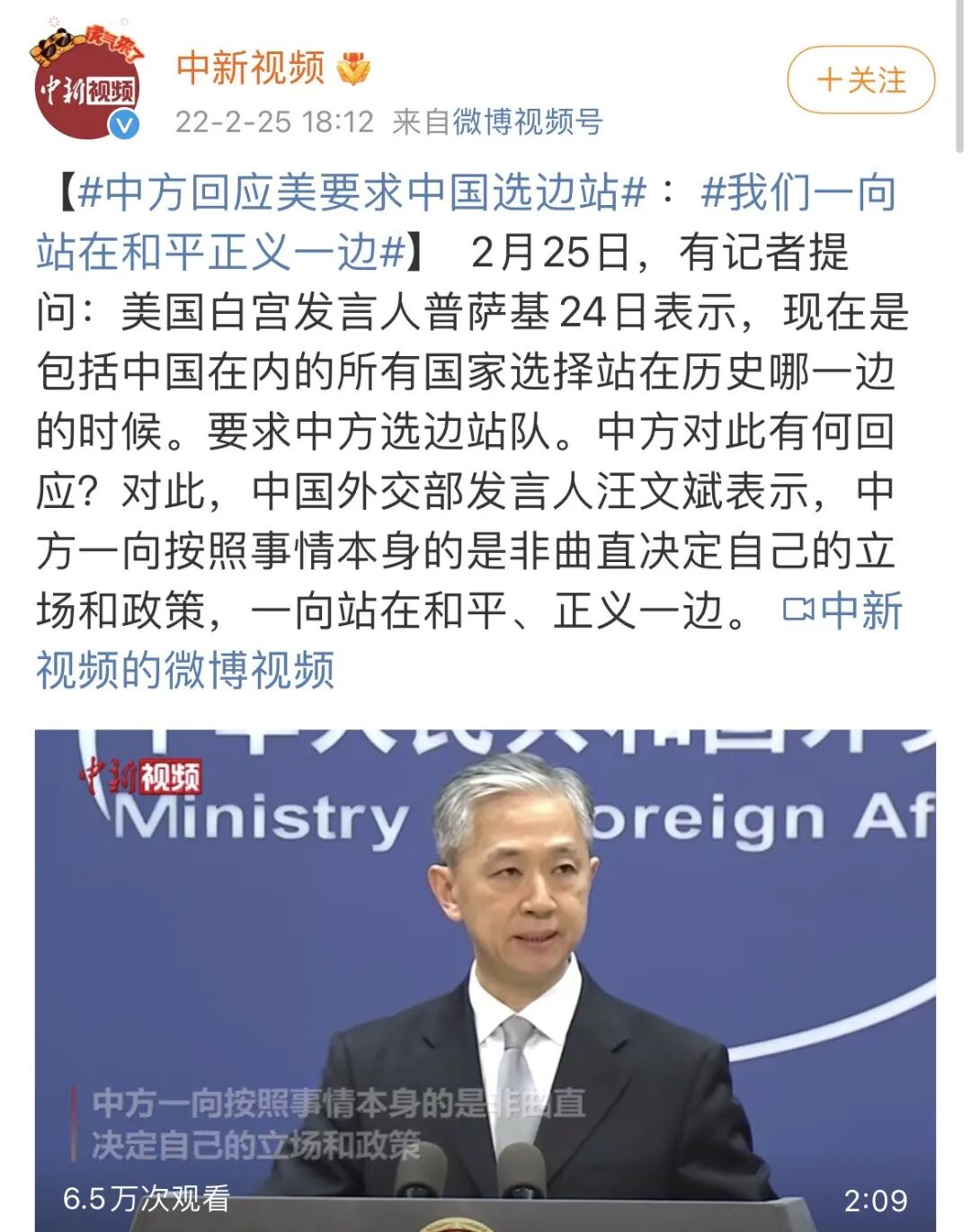 外交部发言人汪文斌在2月25日就公开表示:中国一向站在和平、正义一边。