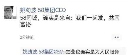在王兴这一共同富裕解释后,58同城创始人姚劲波表示58同城确实是来自:“我们一起发,共同富裕。主业也确实是为人民服务。”