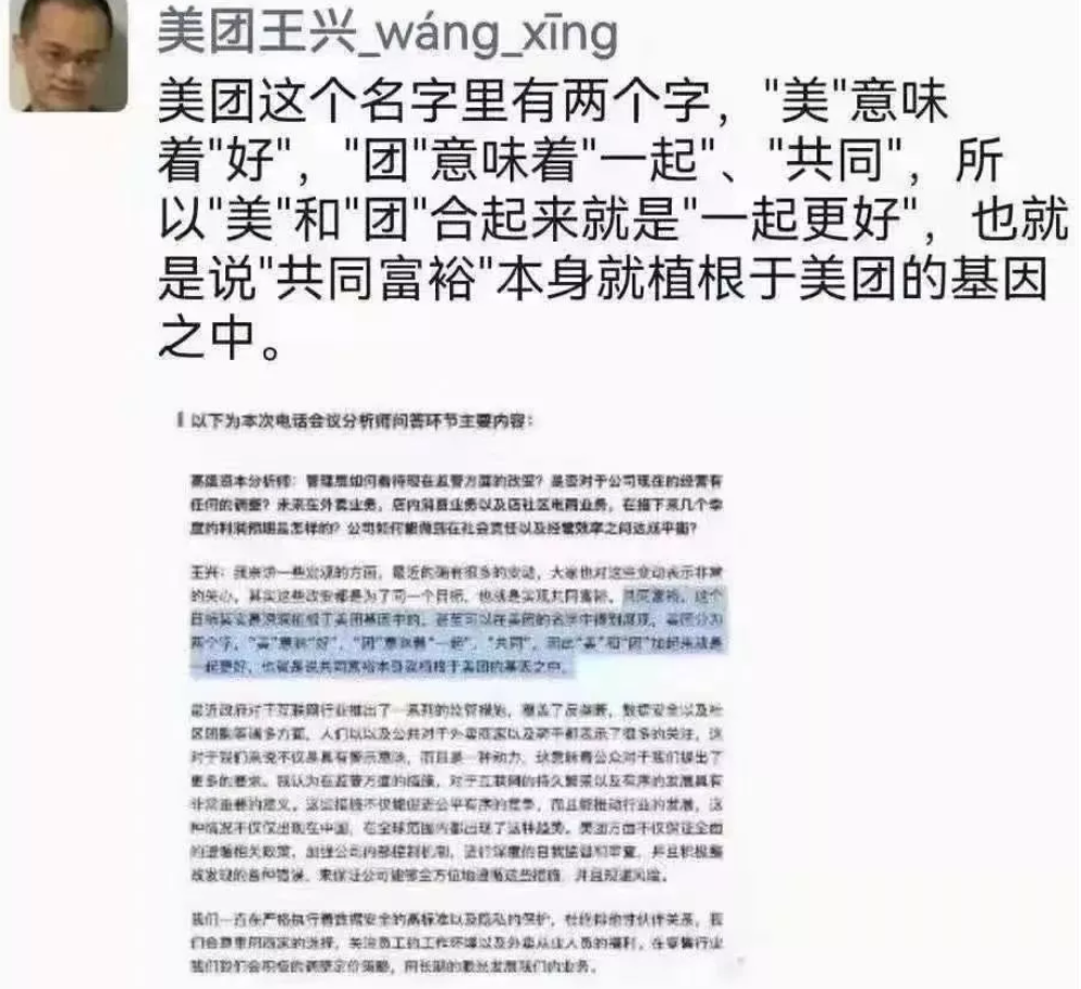 美团CEO王兴也在年报会上对 “共同富裕”进行了分析。王兴称,共同富裕本身就植根于美团的基因中,美团的名字就有“一起更好”的意思,因为“美”就是better,“团”就是together,美团就是一起更好!