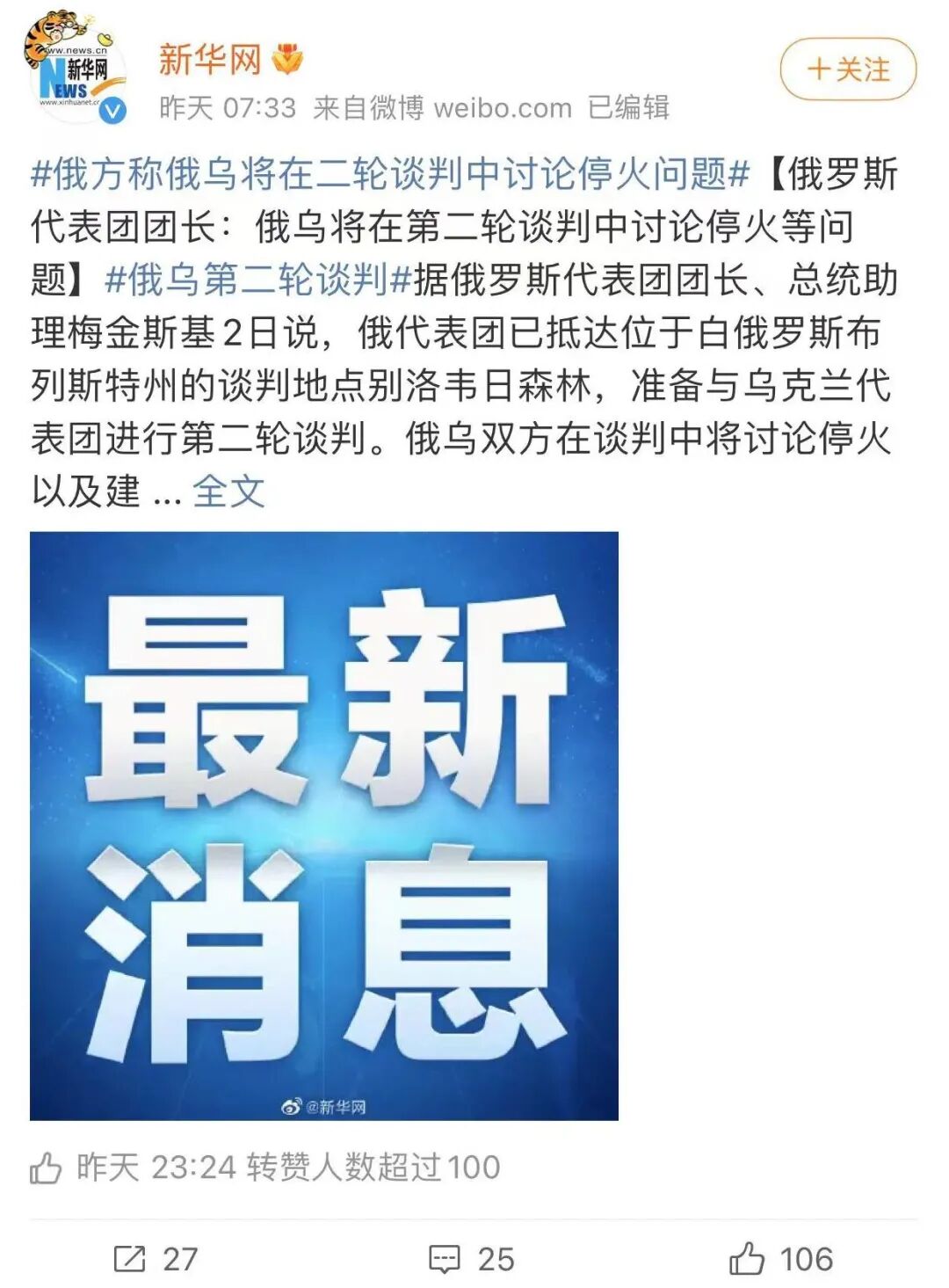 根据最新消息显示,俄乌第二轮会谈结束,俄乌双方就临时停火建立人道主义通道达成一致。