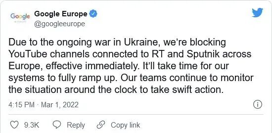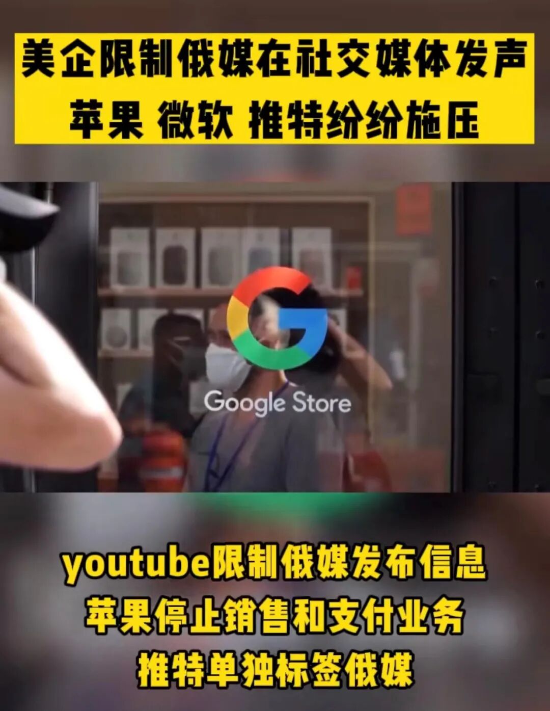 “谷歌、推特、Meta(原Facebook)、Instagram都发声明对俄罗斯做出了制裁,限制俄罗斯媒体在各个社交平台上的发言。”