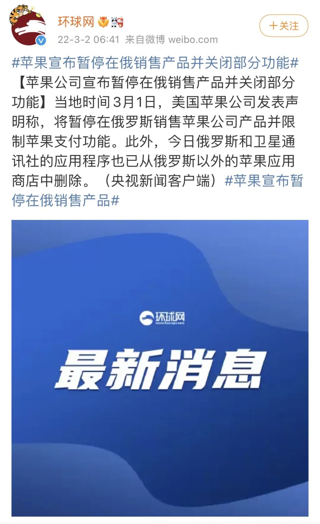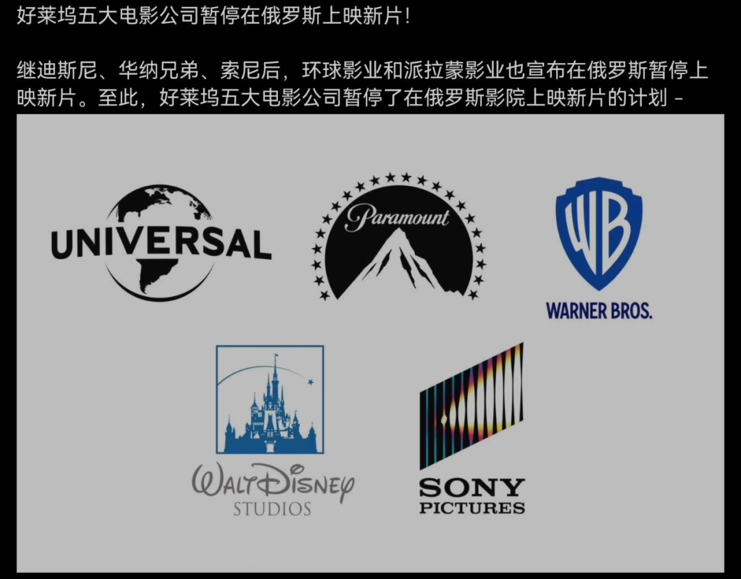 “迪斯尼、华纳兄弟、索尼、环球影业、派拉蒙影业相继宣布在俄罗斯暂停上映新片。”