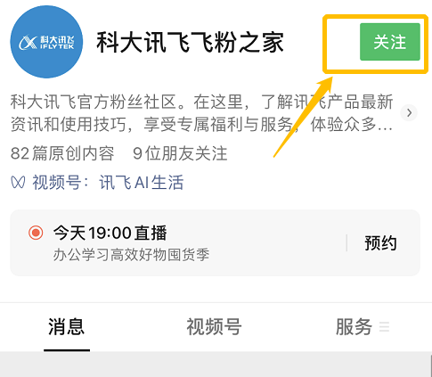 第二步:识别二维码后,再点击跳转页面右上角【关注】公众号【科大讯飞飞粉之家】;(一定要先扫码,再关注公众号哦!)