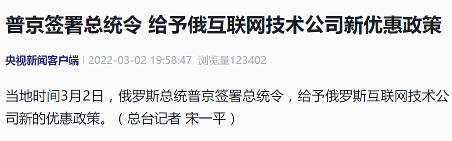 同时,普京签署了总统令,宣布“加强科技人才的培养”,加大对俄罗斯互联网技术公司的扶持。