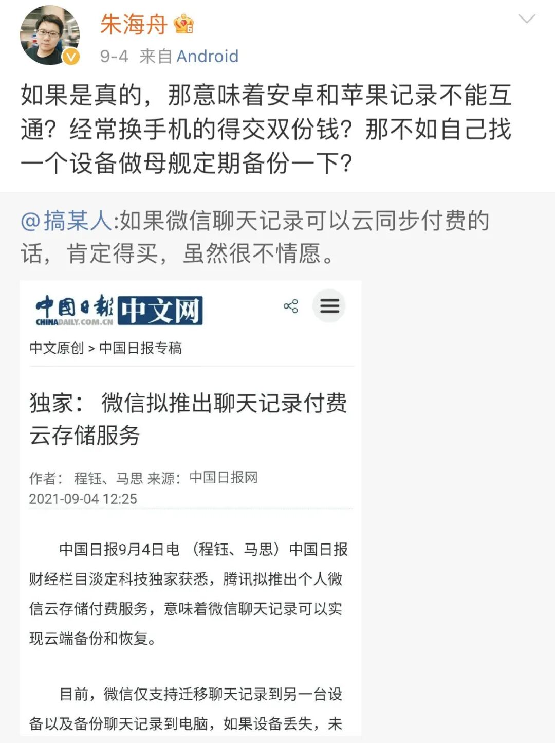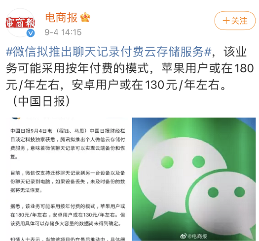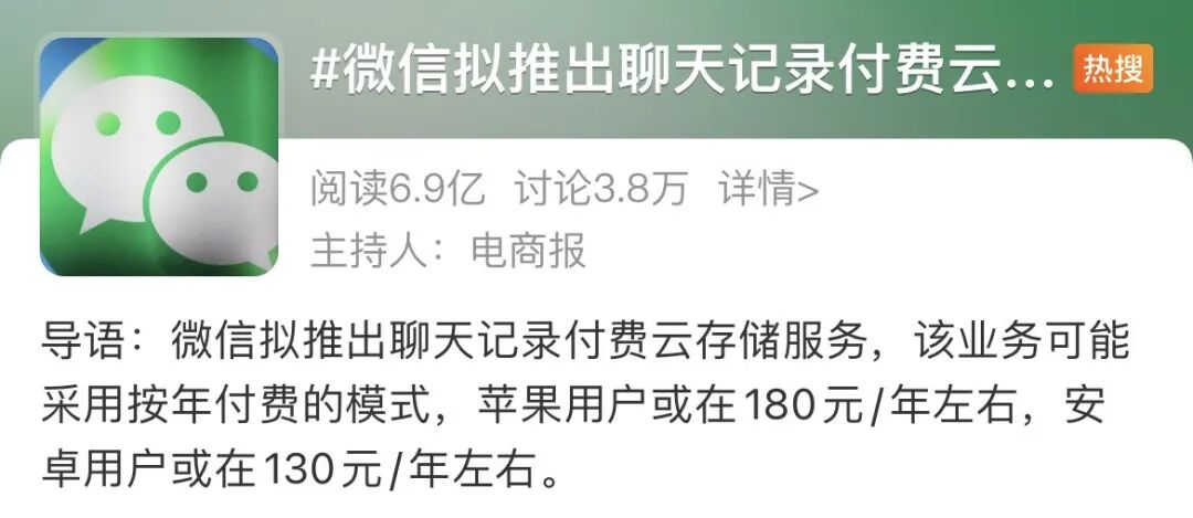 你们又是怎么看的呢?如果微信真的推出了收费版“聊天记录云存储”服务,你们会花钱购买吗?