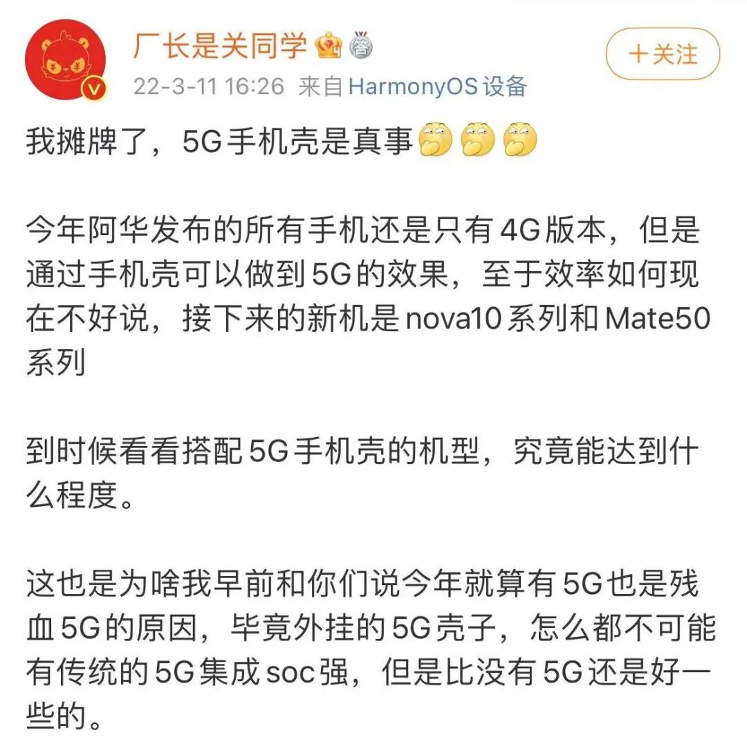最近,有数码博主爆料称,华为接下来的Nova 10系列和Mate 50系列依旧是4G版本,不过,或有希望搭配“5G手机壳”。