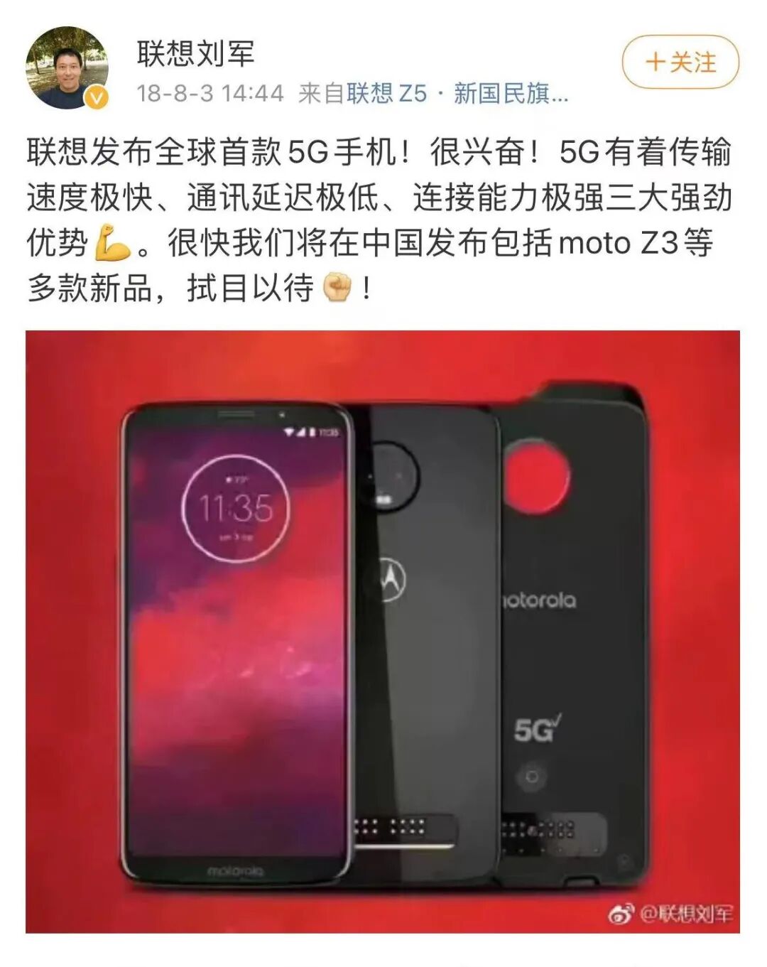 2018年8月,联想旗下摩托罗拉在芝加哥总部发布moto Z3,通过5G背壳可以连接5G网络,这也让moto Z3也成为“全球首款5G手机”。