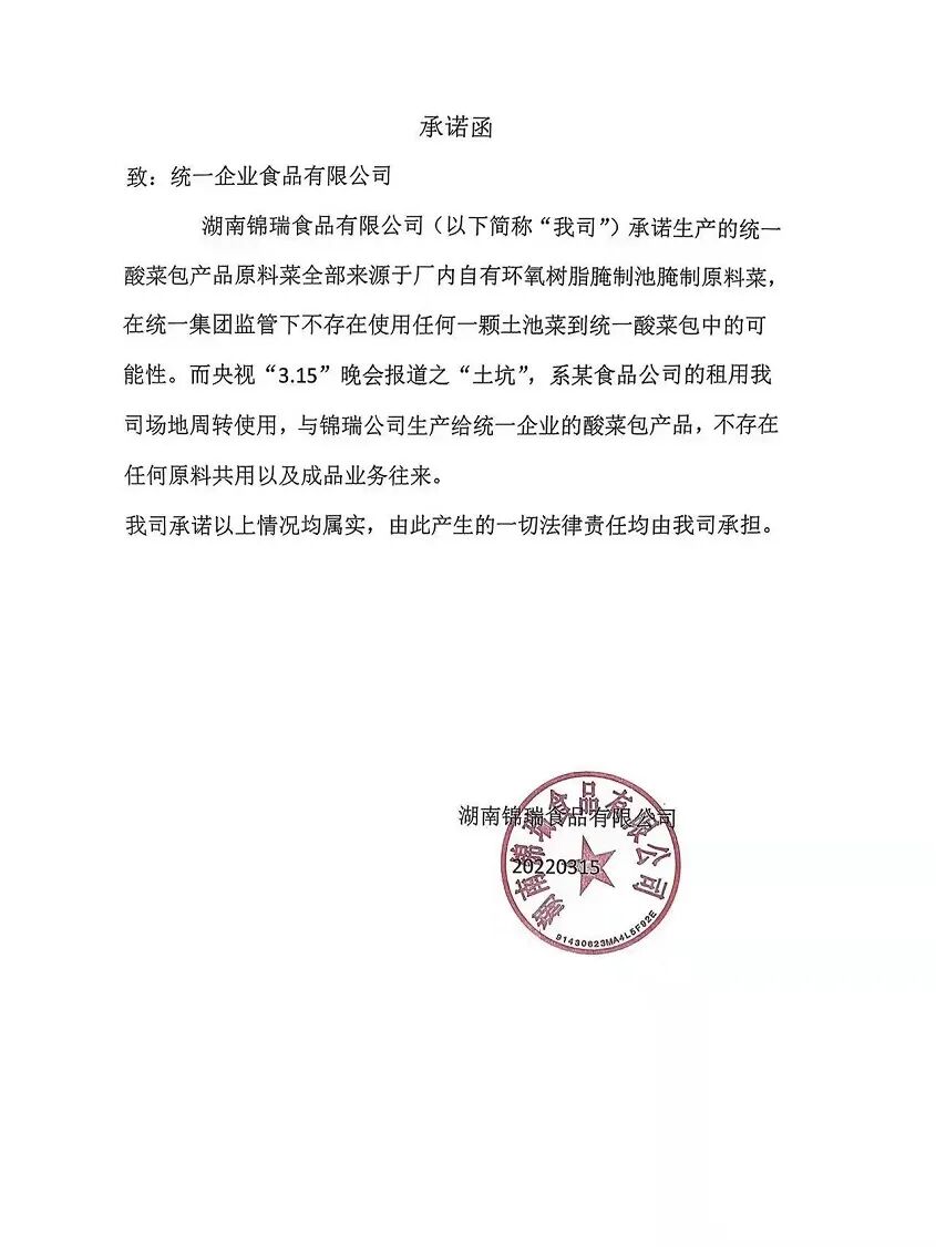 同时,统一已于第一时间约谈了湖南锦瑞公司的负责人,锦瑞公司表示未曾使用“土坑酸菜”制作统一的酸菜原料包。