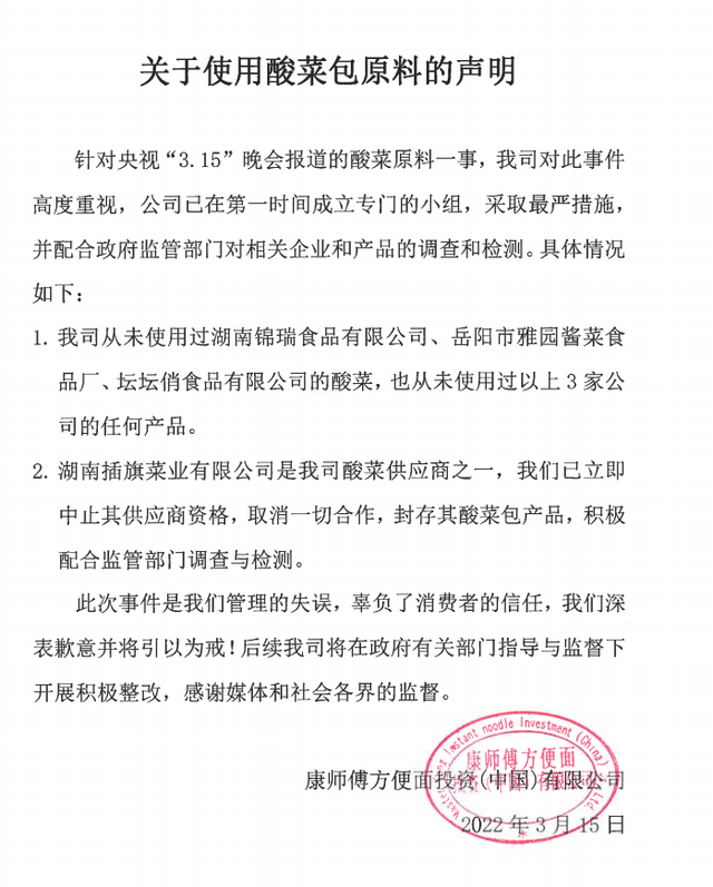 康师傅表示: