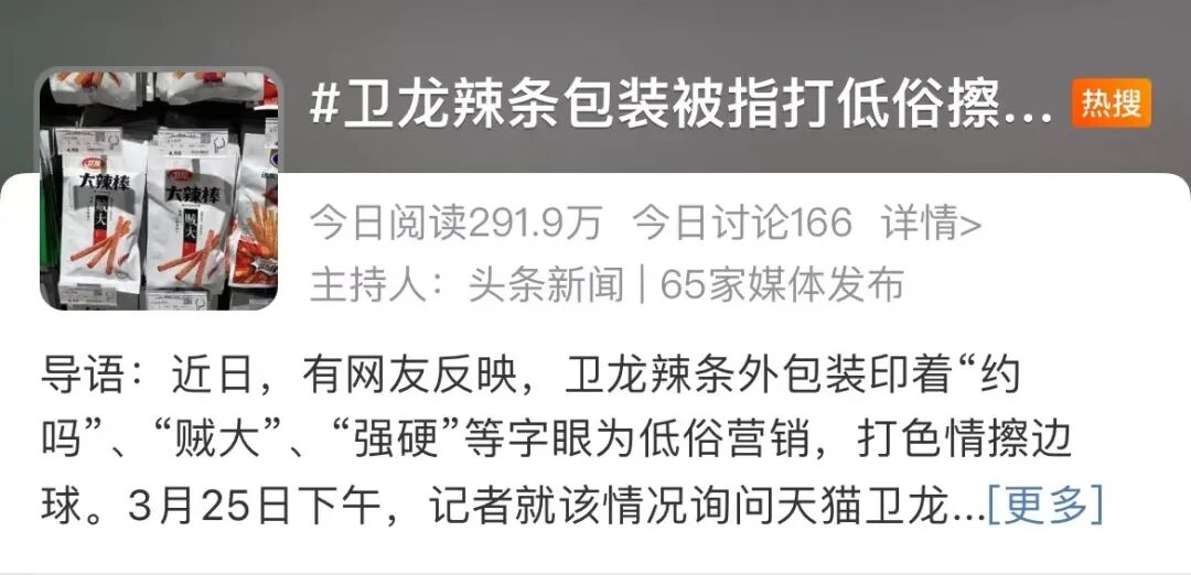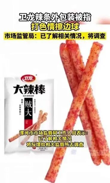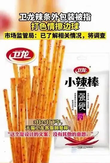 3月25日,媒体报道称有网友反馈卫龙辣条外包装打色情擦边球,比如,大面筋包装上写着“约吗”,大辣棒写着“贼大”,小辣棒写着“强硬”。