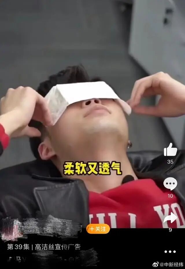 去年年底,高洁丝在某短视频平台发布一则短视频广告,一男子将卫生巾当作眼罩、脚垫和抹布。