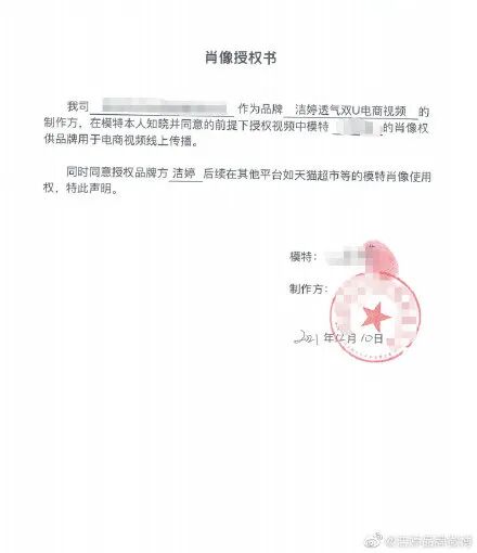 对于网友“偷拍”的质疑,洁婷还拿出了“肖像授权书”证明照片上的是模特。