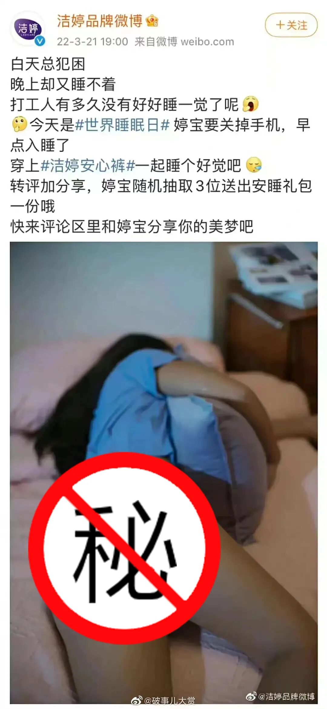 3月21日,洁婷品牌微博发布了一条推文,配图的拍摄角度对准了一位熟睡女性的安心裤。