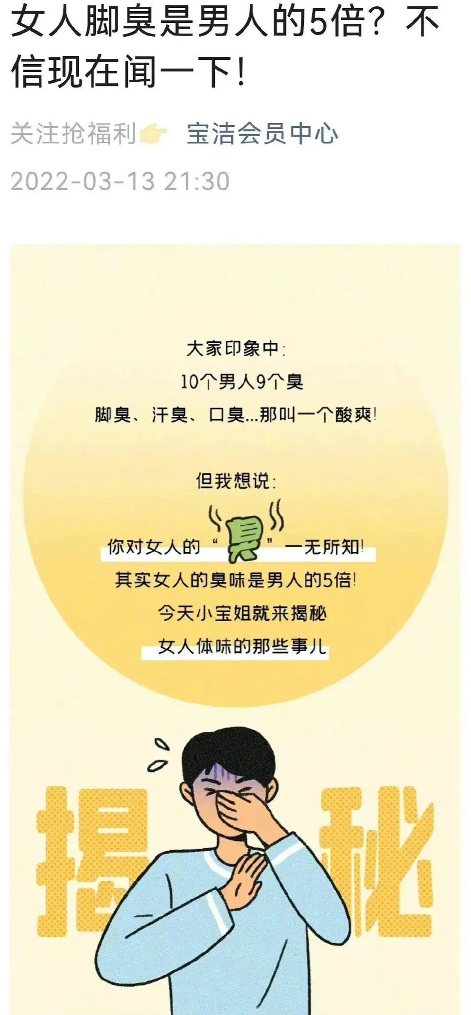 3月13日,“宝洁会员中心”公众号发布了一篇题为《女人脚臭是男人的5倍?不信现在闻一下!》的文章。