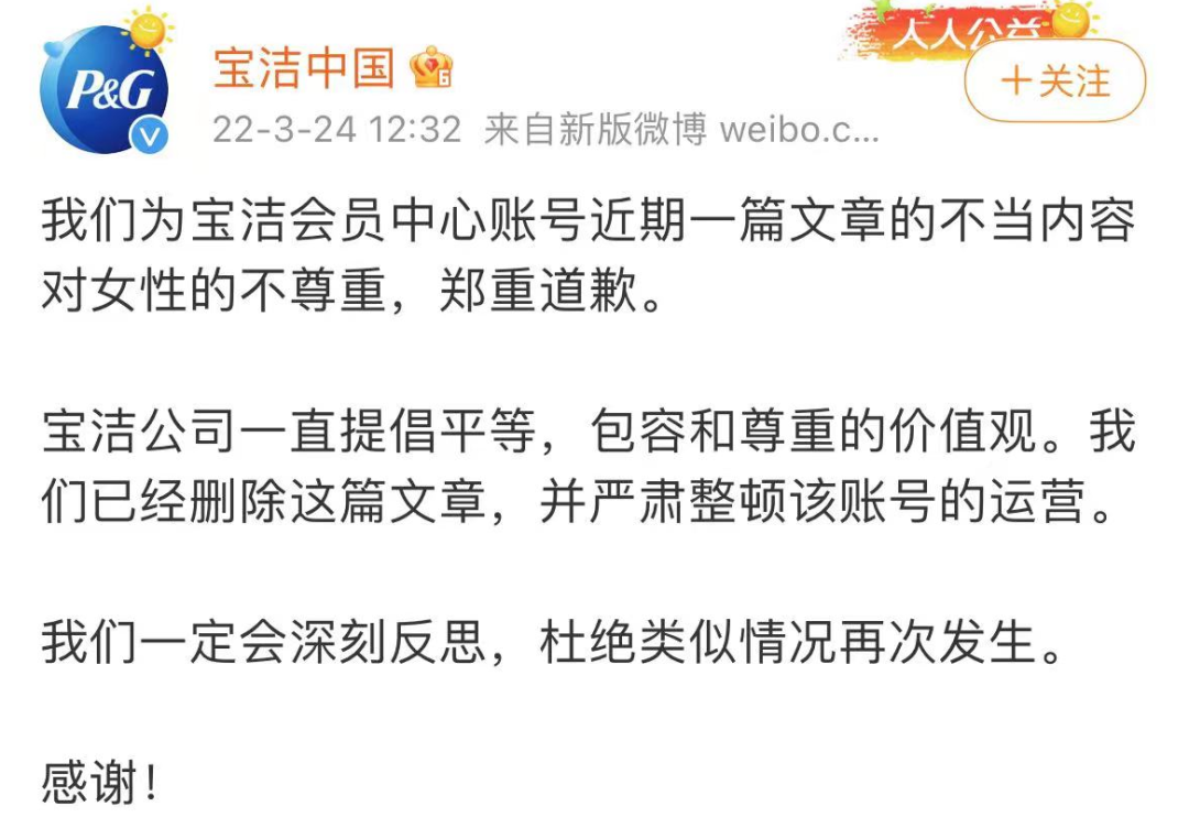 3月24日,宝洁中国发布官方致歉微博,对这篇文章涉及不尊重女性的内容郑重道歉,并表示已经删除这篇文章。