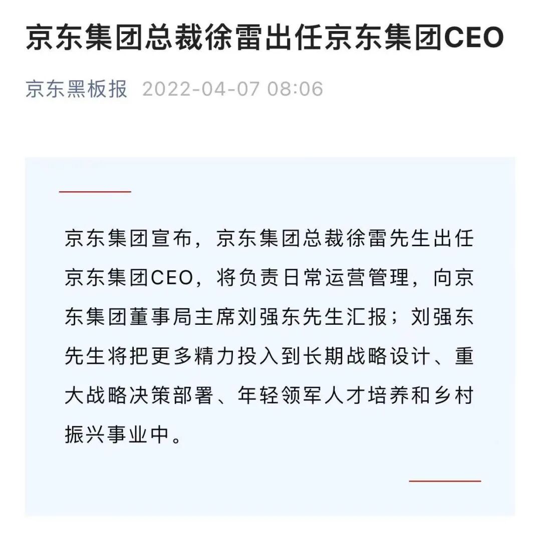 同时,现任京东集团总裁徐雷升任CEO,将以执行董事的身份加入京东集团董事会,所有任命立即生效。