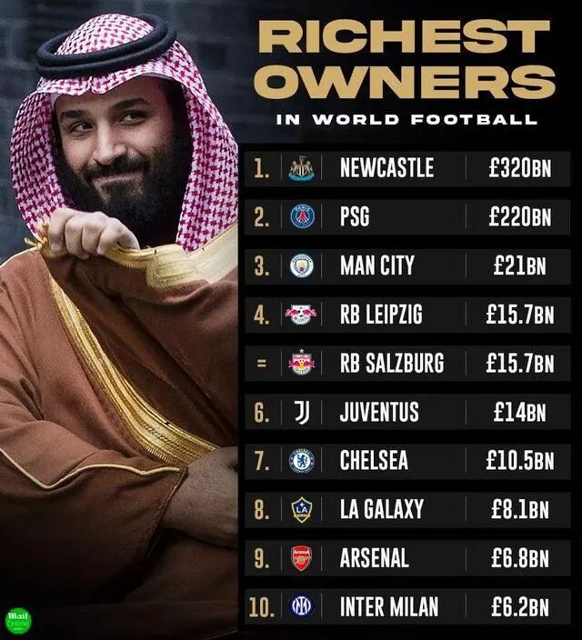 去年,由萨勒曼担任主席的沙特主权基金公共投资基金,还以约3.05亿英镑(约合人民币27亿元)的价格,买下了英超纽卡斯尔联俱乐部。
