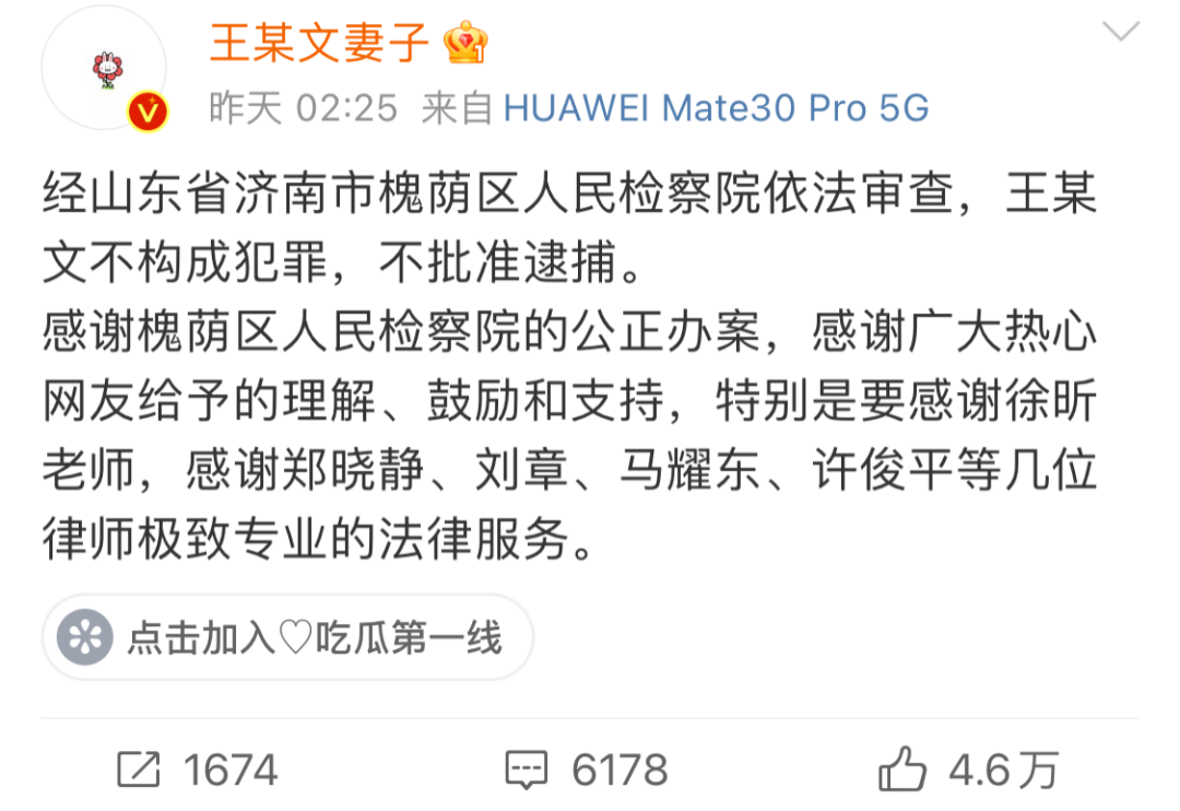 消息公布后,今日凌晨,王某文妻子微博发文称: