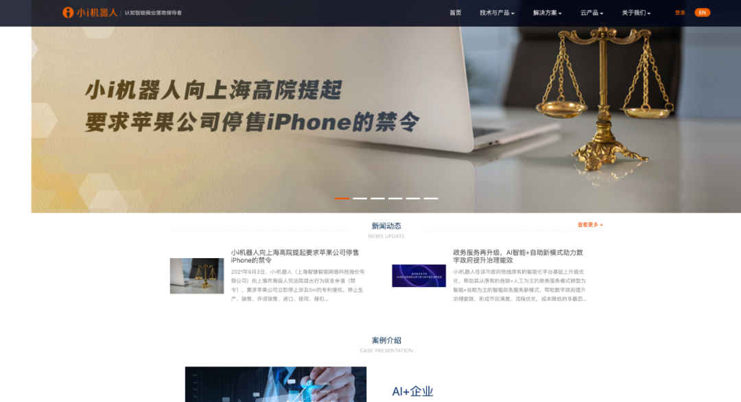 有意思的是,这家“小i机器人”官网的头版头条,并不是宣传自家产品/服务,而是直接挂出:——“小i机器人向上海高院提起要求苹果公司停售iPhone的禁令”