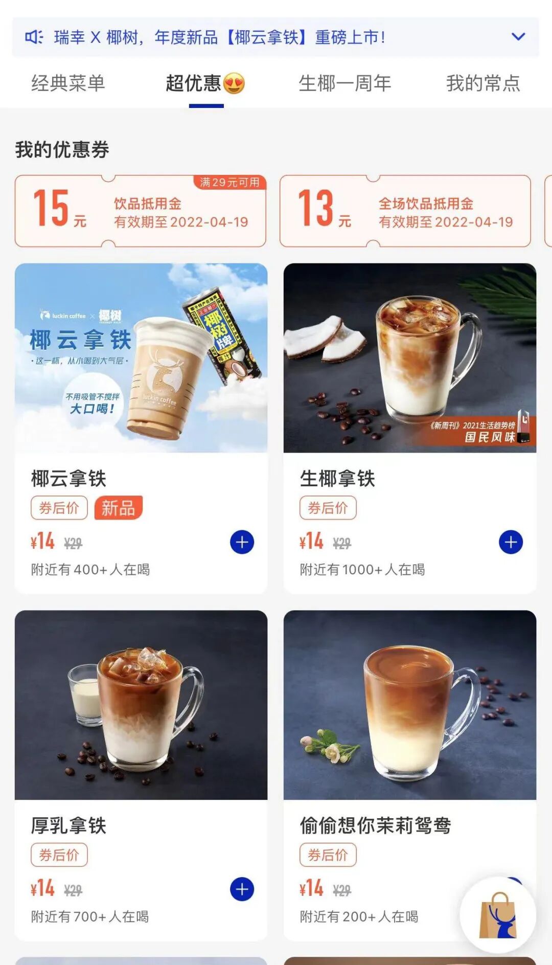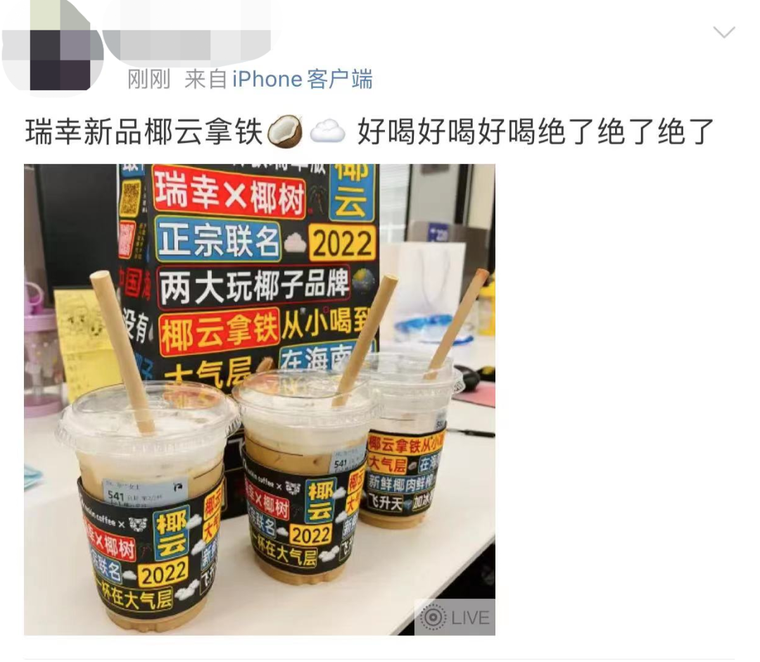 4月11日,瑞幸咖啡官宣与椰树联名的“椰云拿铁”正式上市。