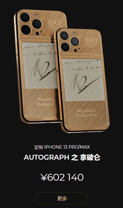 还有献给法国皇帝拿破仑·波拿巴的iPhone 13 Pro,它把拿破仑的签名给放到机身上,用了24k黄金,售价60万元。
