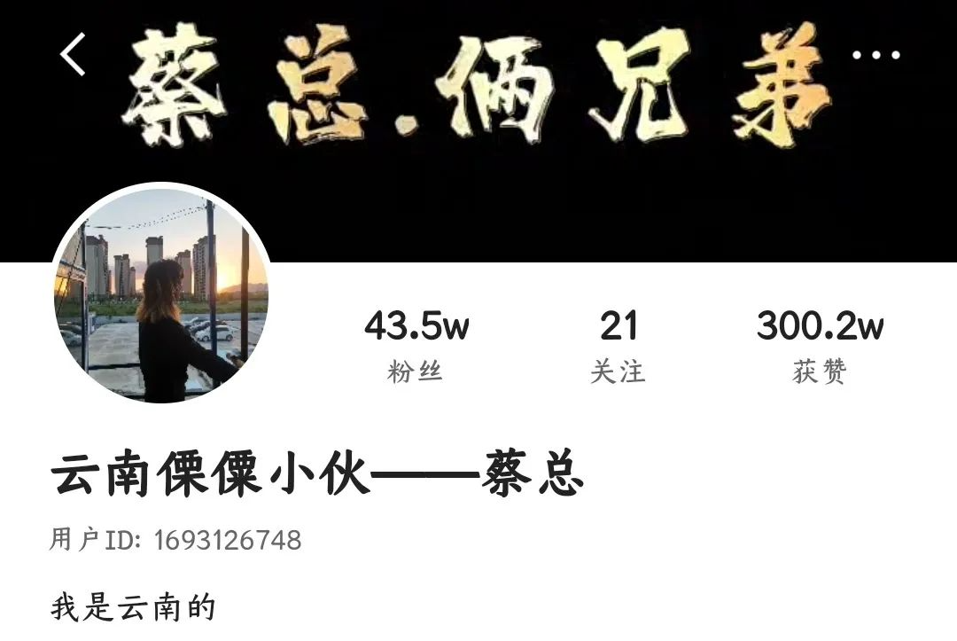 兄弟俩闲暇时间会在快手拍短视频,最近就凭着“我是云南的”迅速刷屏走红,快手账号@云南傈僳小伙——蔡总 迅速涨粉到40多万。