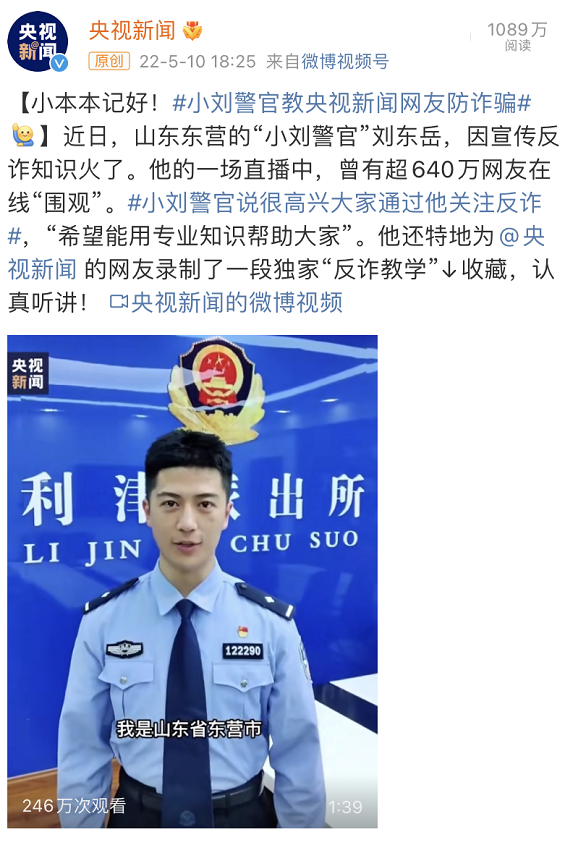 最近抖音上,一个在直播间宣传反诈知识的“小刘警官”火了!光一场直播就有640万网友在线观看。