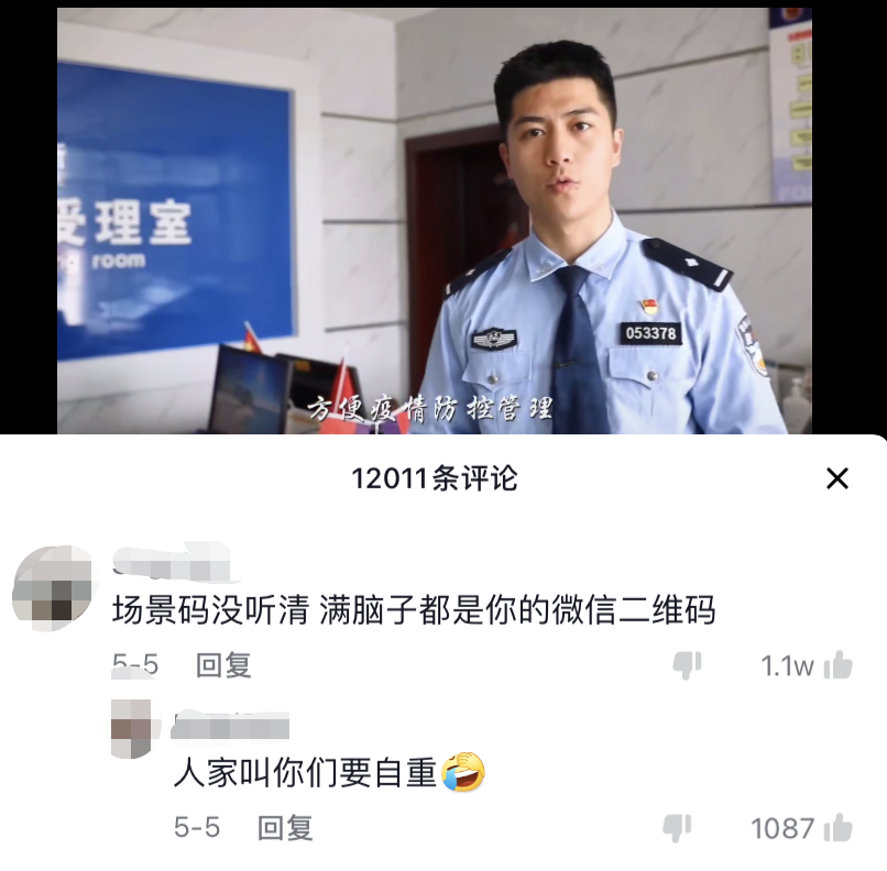 小刘警官在讲解什么是场所码时,网友评论区刷要他的微信二维码。