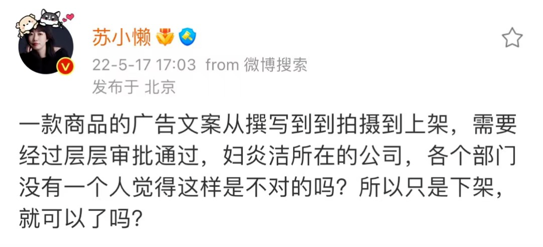 但就如博主@苏小懒所言,像妇炎洁这样体量的公司,广告的制作、发布全流程应该有层层审批。