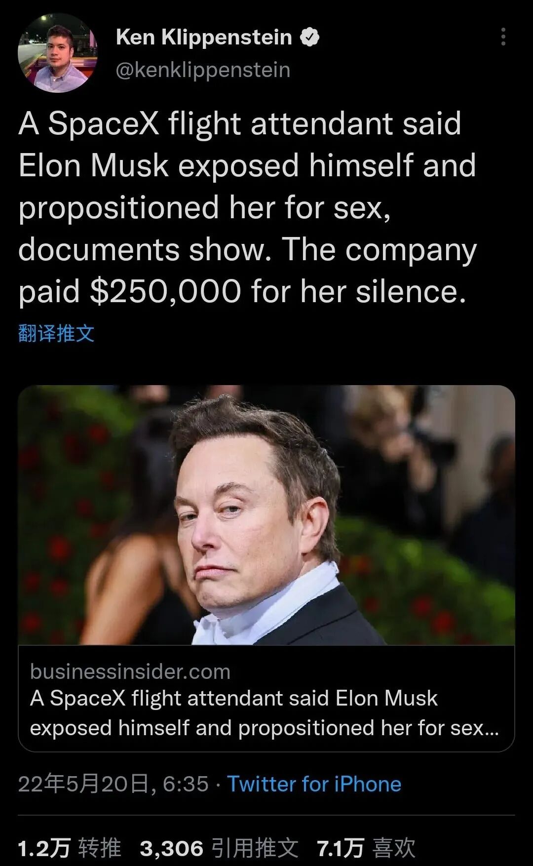 最终双方达成协议:空姐从Space X离职并拿到25万美元“封口费”,空姐本人不得起诉马斯克。